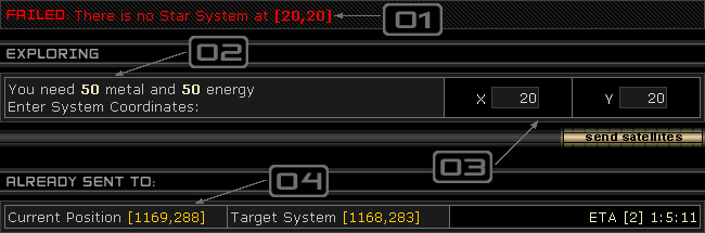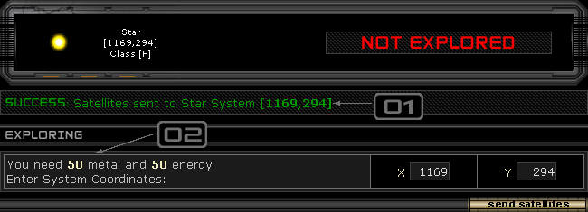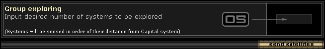 NOTE: Exploring from the System screen does not require system coordinates - they will be automatically filled. ![]() To explore more than one system you may use group exploring. Specify desired number of systems you want to be explored and press the Send Satellites button.