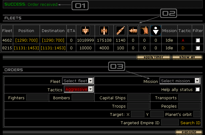 HUMAN - Fleets In this screen you'll get a list of all fleets with specific info, such as current and target positions, the amount of specific units, their mission, etc. ![]() Action result message. Fleets list with additional information for each of them. Orders form. Here is where you give orders to your fleets.