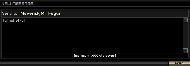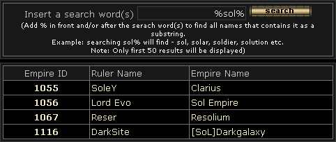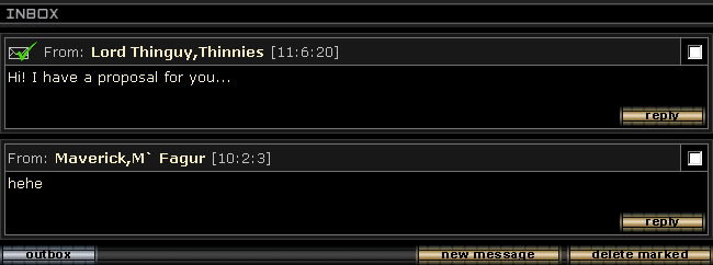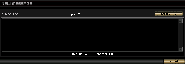 HUMAN - Messaging system Sharing secret information is an important part of all strategy games. Although there are a lot of external ways of communication (ICQ, e-mail, etc.), Delta Quadrant: Empires provides its own ingame messaging system. ![]() All incoming messages will be plased in Inbox directory and will be sorted out, so as new ones will be always on top of the list. Messages you see for first time will be marked with an icon in the top left corner of the message. You can also find in the message body who is the sender and when it arrived. There are some functions available regarding messages. WRITE NEW MESSAGE To write a new message press New message button. To send it you need the Empire ID of the receiver. After inserting it and adding the message text, just press the Send message button and the receiver will instantly get your message. ![]() In case you don't know the Empire ID you can easily find it. Press Search ID button. A window will pop up with a search system. ![]() You can insert just a substring. The search system will try to find this substring in Ruler and Empire names. First 50 matches will appear in a list with their Empire's ID. All messages which you send will be plased in a separate directory. Press Outbox button to view them. REPLY You can directly reply to a message by pressing Reply button. In this case a form will appear that will include the message text you are replying to. ![]() DELETE To delete one or several messages - just check the respective boxes and press Delete marked button. |