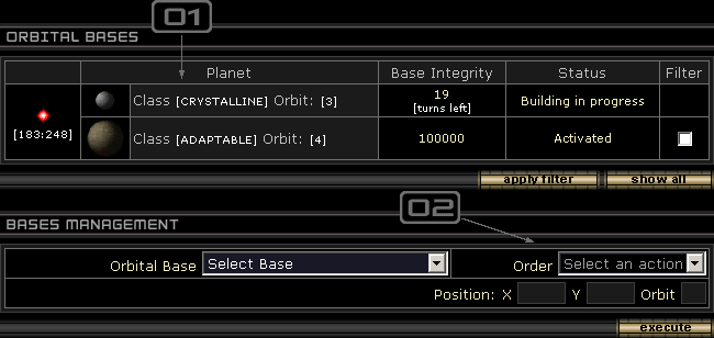 HUMAN - Orbital Bases Orbital Bases are an essential part of the Human defense system. Each planet can have only 1 Orbital Base. In this screen you'll get a list of all existing/ordered Orbital Bases with specific info such as position, integrity, etc. ![]() Orbital Bases list with additional info.